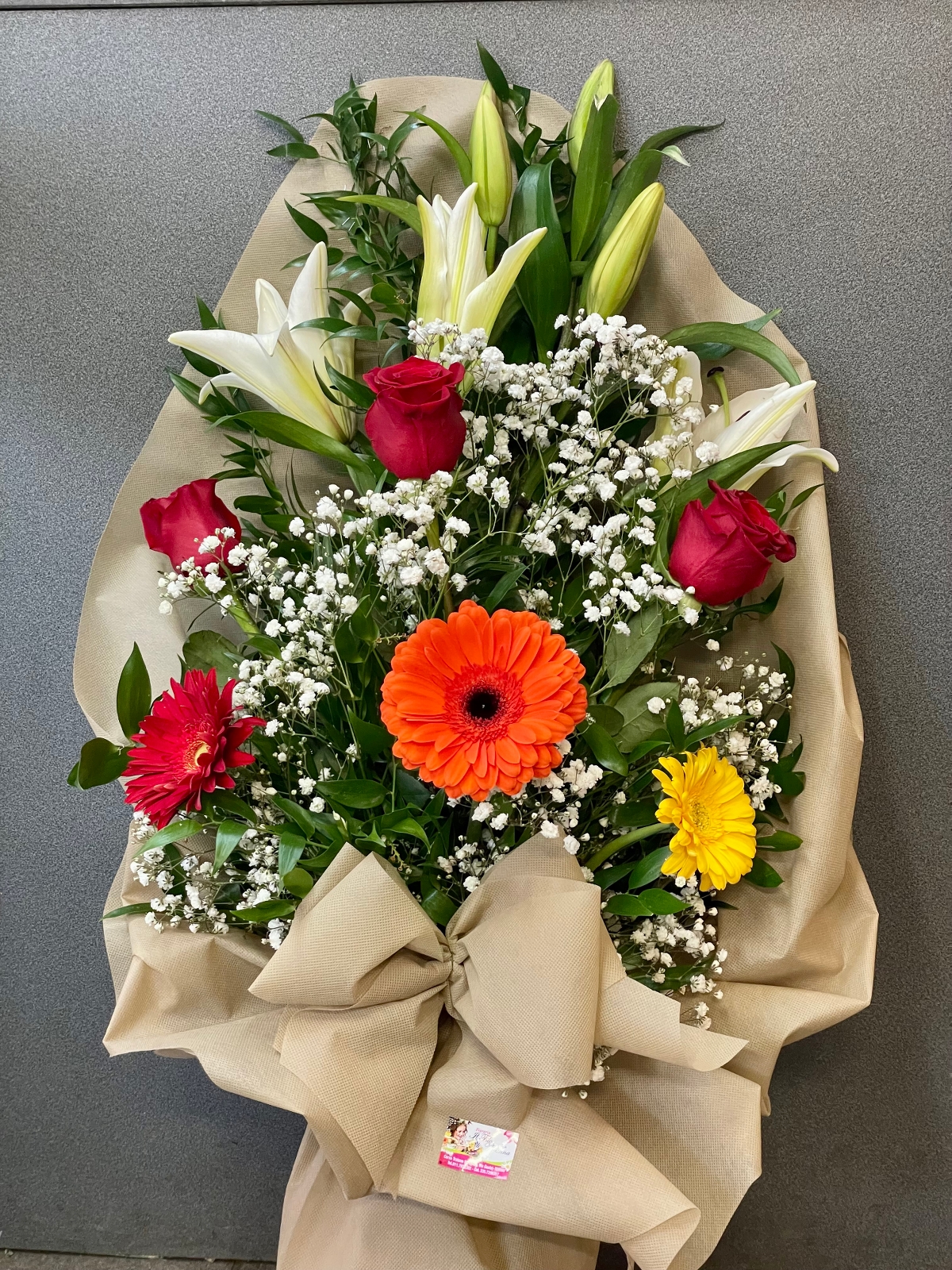 Ti proponiamo questo mazzo funebre con 1 lilium Casablanca bianco, 3 gerbere di colori misti, 3 rose rosse a stelo lungo, gypsophila e verde decorativo.